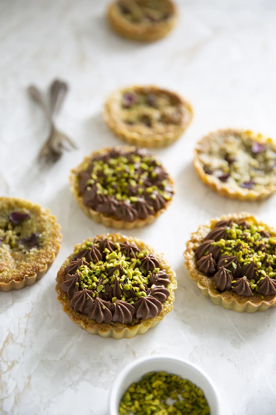 12. Once the tartelettes are cool, pipe the chocolate cream on top in any shape you desire and decorate with coarsly chopped pistachios